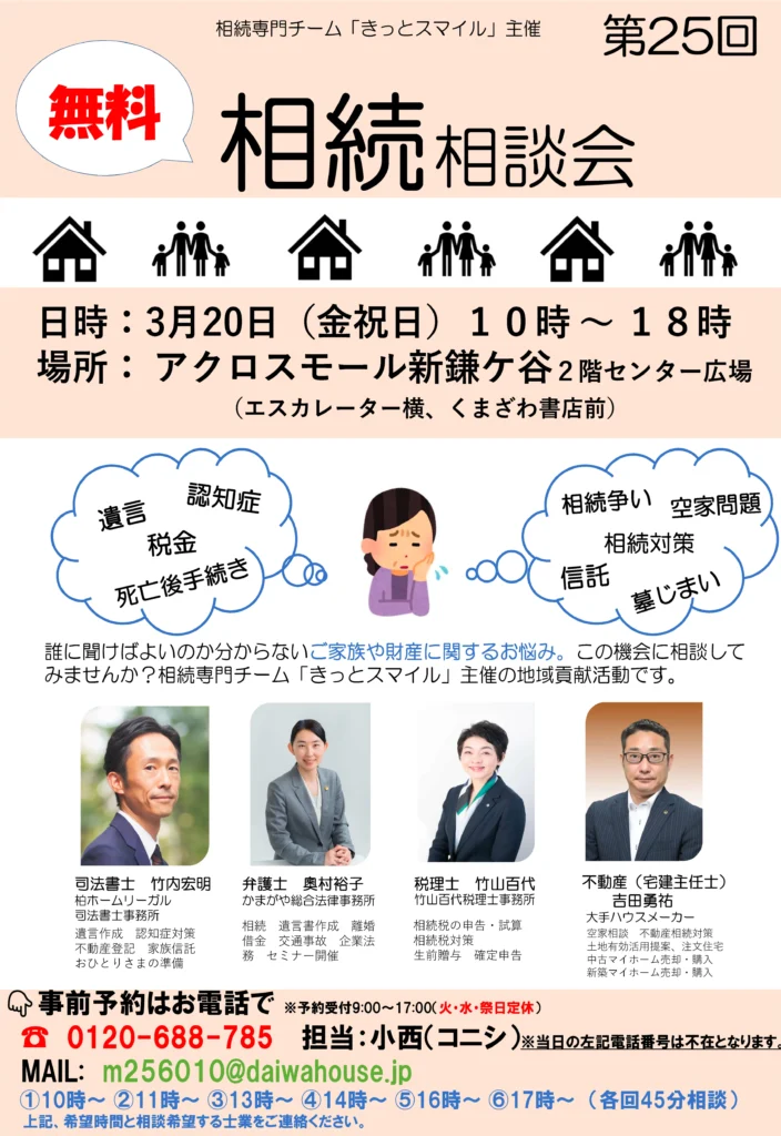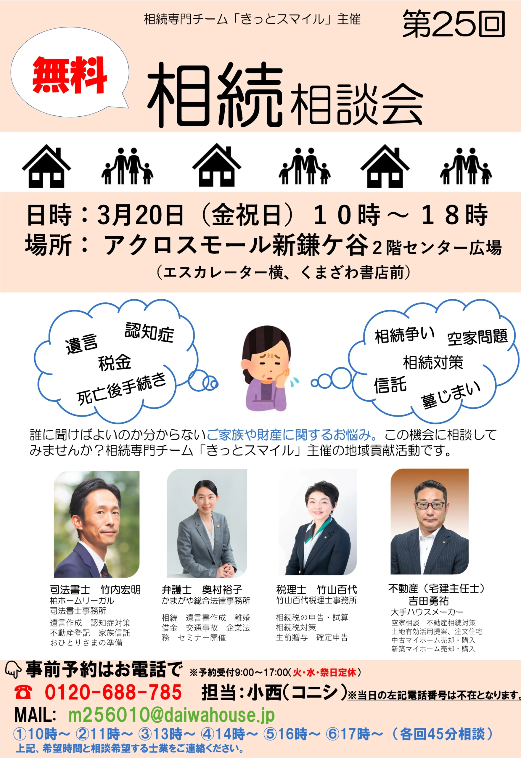 2、3ヶ月に1度、相続診断士兼税理士として「相続相談会」を開催しています。「いつか相続のことも考えないとな」と思っている方などへ向けて、無料で気軽に相談できる機会があると良いと思い、開催しています。まずは相続について考えることから始めませんか?